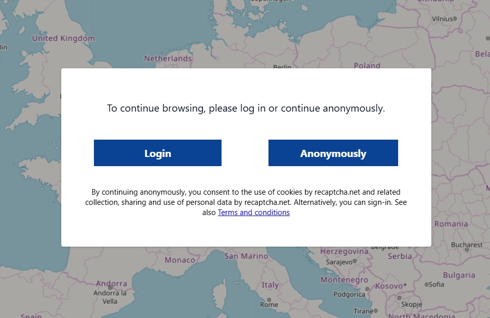Svarīgi!! Lietošanas sākumā vai ik pa brīdim var paradīties piedāvājums (sk. attēlu zemāk) pierakstīties Copernicus profesionālā lietotāja sistēmā ar dažādam papildus maksas iespējām, kas domāta zinātniekiem un IT speciālistiem. Lai vienkārši izpētītu savu lauku spiediet ANONYMOUS